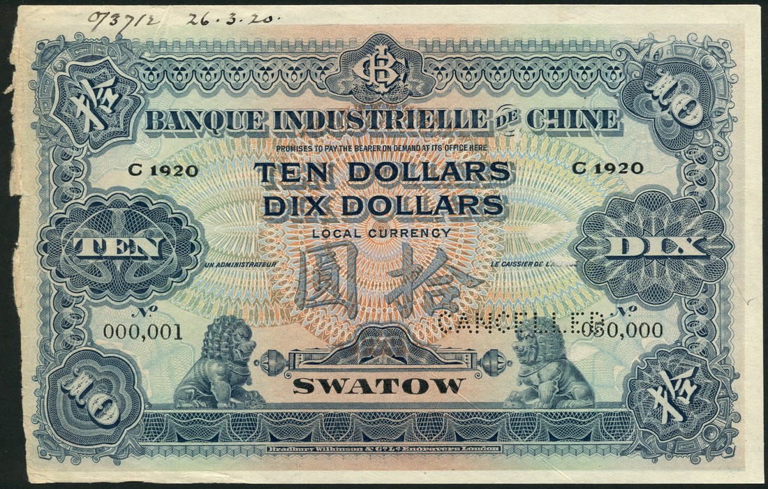 Banque Industrielle de Chine, Swatow, specimen $10, Swatow, 1920, serial number 000001-050000, blue, yellow ochre and pale pink and green, ornamental lion (chinze) low left and right, SWATOW in text low centre, reverse purple, pale blue and orange, city gate at right