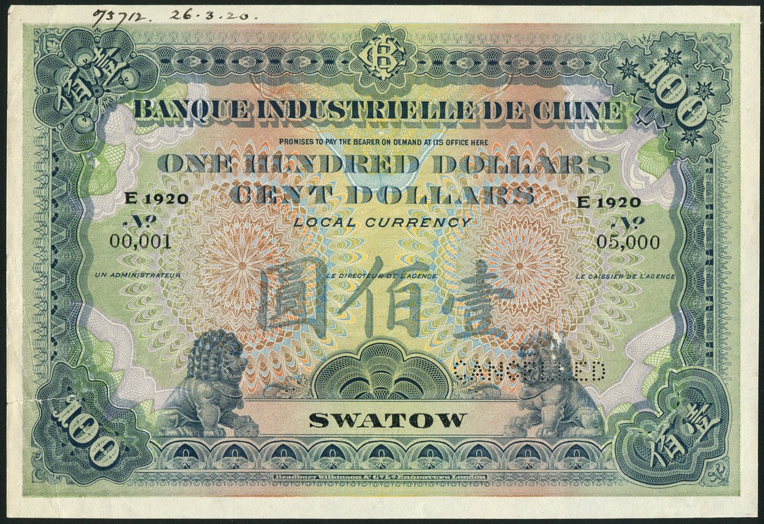 Banque Industrielle de Chine, Swatow, specimen $100, Swatow, 1920, serial number 00001-05000, green, blue, yellow, lilac and orange, ornamental lion (chinze) low left and right, Bank initials elided top centre, SWATOW in text low centre, reverse purple, yellow and brown, the Great wall of China at centre, value at left and right