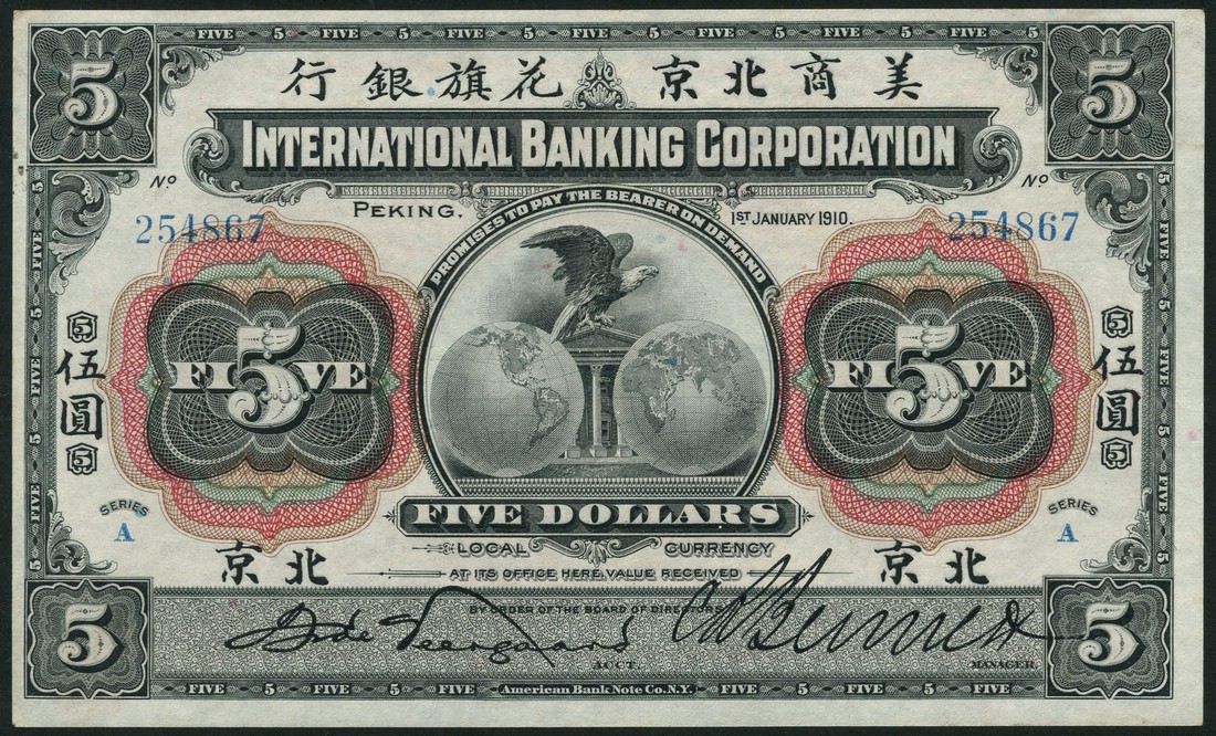 International Banking Corporation, $5, Peking, 1 January 1910, blue serial number 254867, black, white and pink and green, twin globes and eagle at centre, value at left and right and at each corner, two printed signatures below, reverse red, twin globes and eagle at centre