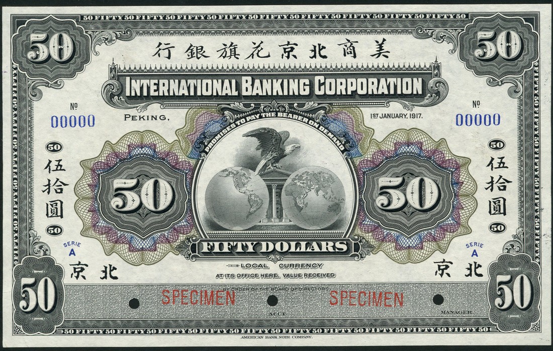 International Banking Corporation, specimen 50 dollars, Peking, 1917, serial number 00000, grey on multicolour underprint, eagle on building between two globes, at centre, red stamped specimen right and left, reverse, purple, 3 punch marks at bottom,