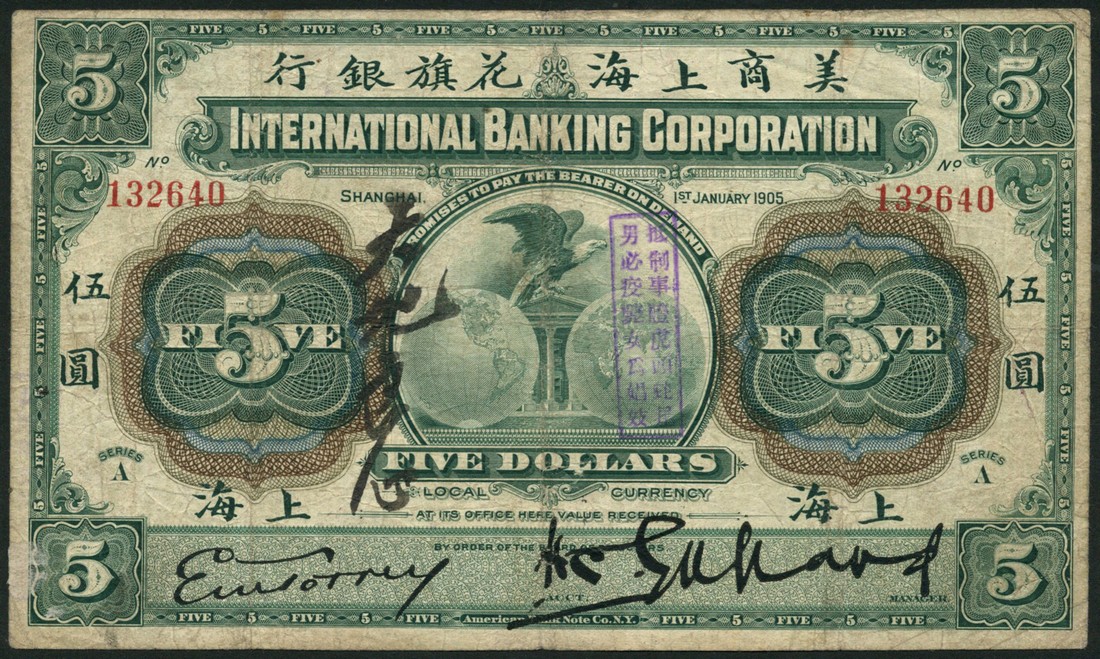 International Banking Corporation, $5, Shanghai, 1 January 1905, red serial number 132640, green, white and brown, twin globes and eagle at centre, value at left and right and at each corner, two printed signatures below, reverse green, twin globes and eagle at centre
