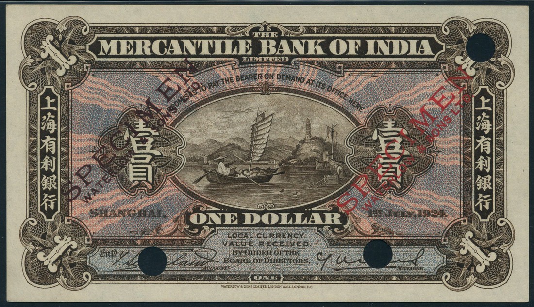 Mercantile Bank of India Limited, colour trial $1, Shanghai, 1 June 1924, no serial numbers, dark brown, pink and mauve, sampan and pagoda on island at centre, value at left and right and at each corner, two printed signatures below, reverse green, head of Mercury at centre, value at each corner