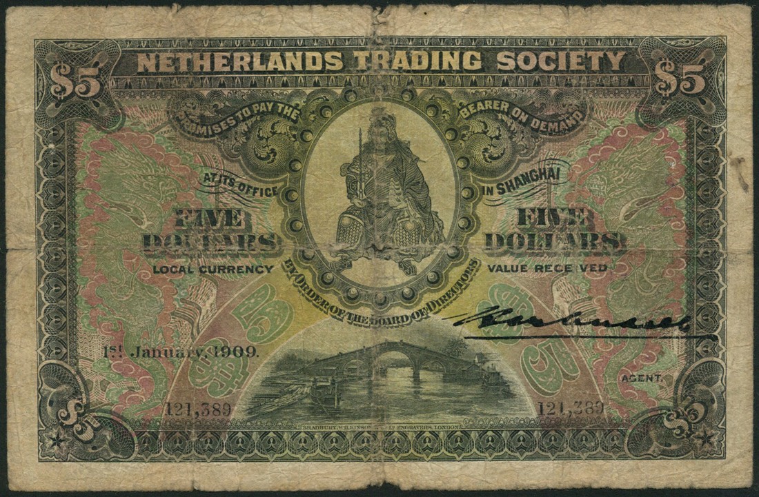 Netherlands Trading Society, $5, Shanghai, 1 January 1909, serial number 121389, black and multicoloured, Orintal warrior top centre, bridge below, dragon at left and right, manuscript signature low right, reverse green, dragons and arms