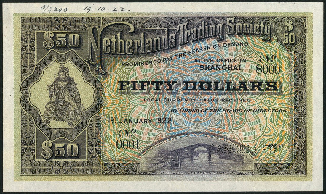 Netherlands Trading Society, specimen $50, 1 January 1922, serial number A 0001-8000, purple, green and pink, Oriental warrior at left, bridge and river scene low centre, value at centre, top left and right and low left, reverse green and grey, arms top centre, arms of the bank low centre, the Netherlands lion at left and right in oval frame, value at each corner