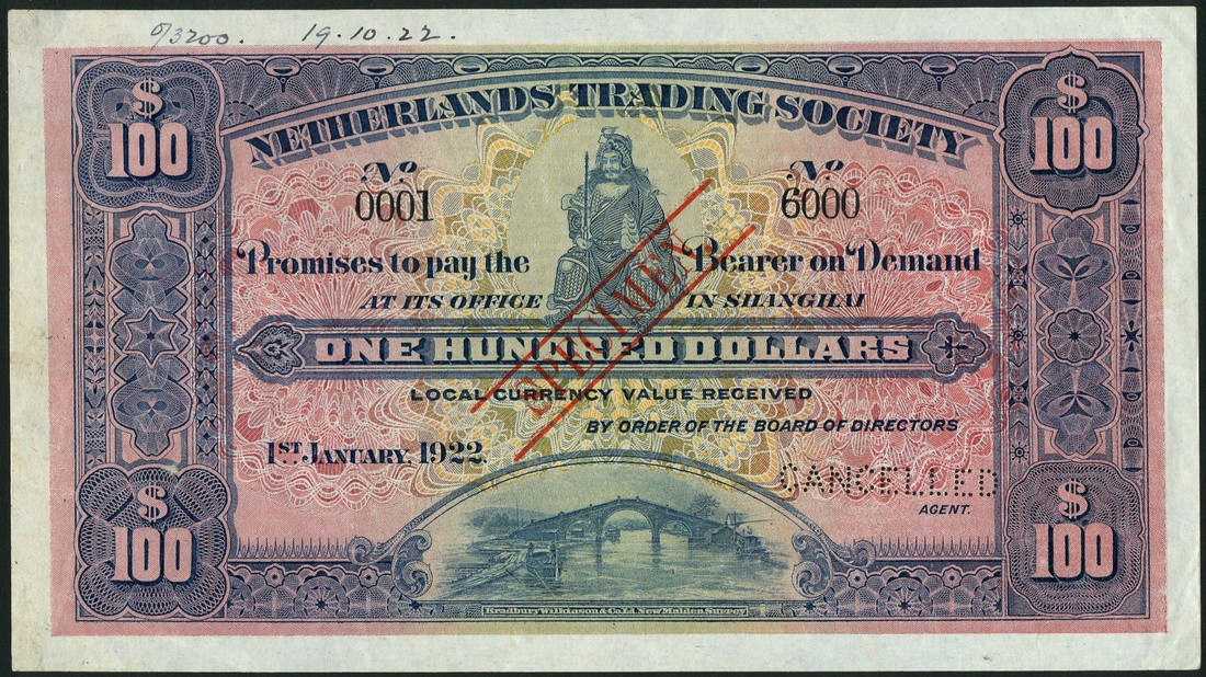 Netherlands Trading Society, specimen $100, 1 January 1922, serial number A 0001-6000, purple, green, orange and pink-red, Oriental warrior top centre, bridge and river scene low centre, value at centre, top left and right and low left, reverse purple, lilac, pale blue and orange, arms top centre, arms of the bank low centre, the Netherlands lion at left and right in oval frame, value at each corner