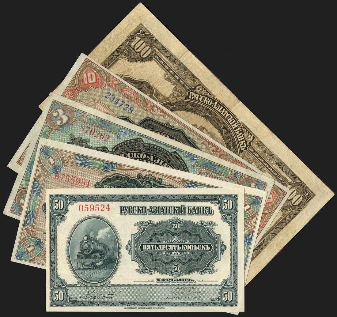 Russo-Asiatic Bank, 50 kopecks, grey, 1,3,10 and 100 rubles, all ND (1917), multicoloured, all with locomotive vignertte
