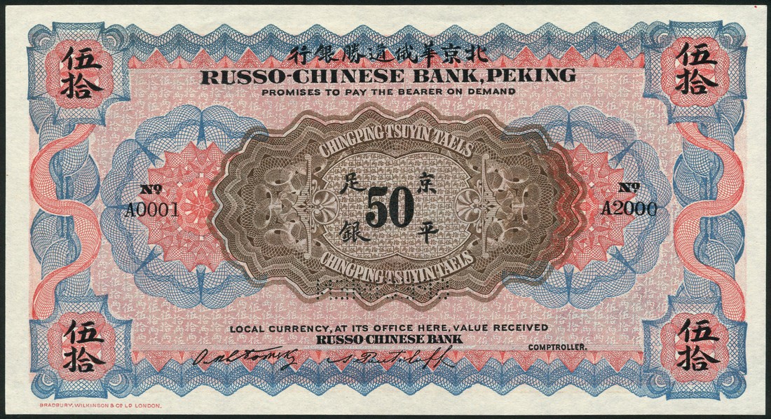 Russo-Chinese Bank, Peking, specimen 50 Chingping Tsuyin taels, ND (1907), serial number A 0001-A 2000, brown, pink and blue, value at centre and at each corner, two printed signatures below, reverse brown and white, dragon at centre, vertical format, value at each corner