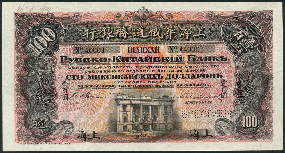 Russo-Chinese Bank, specimen 100 Mexican dollars, Shanghai, ND (1909), serial number A 0001-A4000, black, pink-red and orange, bank building low centre, dragon at left and right, value at centre and at each corner, Russian text, reverse green, mauve, pale blue and orange, dragon at left and right, English text