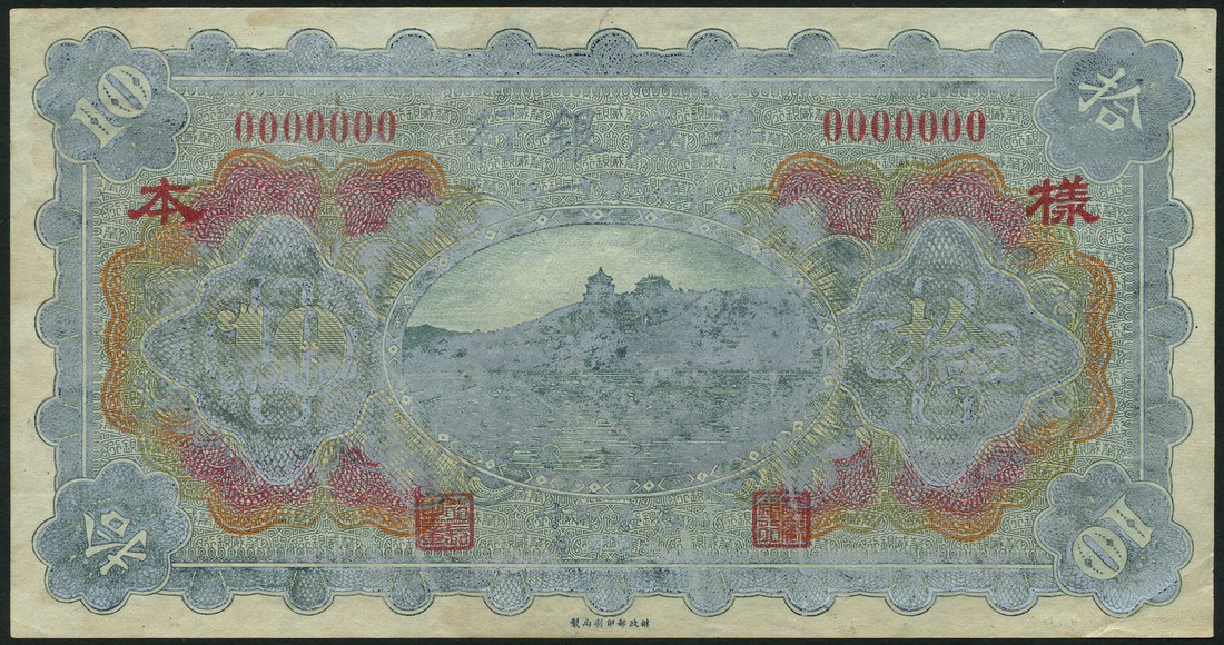 Sino Scandinavian Bank, uniface obverse and reverse specimen 10 yuan, no place of issue, 1922, red zero serial numbers, blue, lakeside scenery at centre, Viking ship on reverse