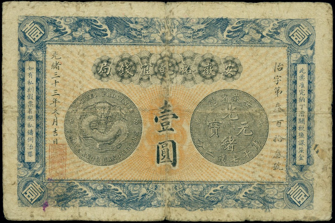 Anhwei Yu Huan Bank, $1, 1907, blue and yellow, blue dragon borders, picture of an Anhwei silver dollar left and right, Chinese text on reverse with two red seals