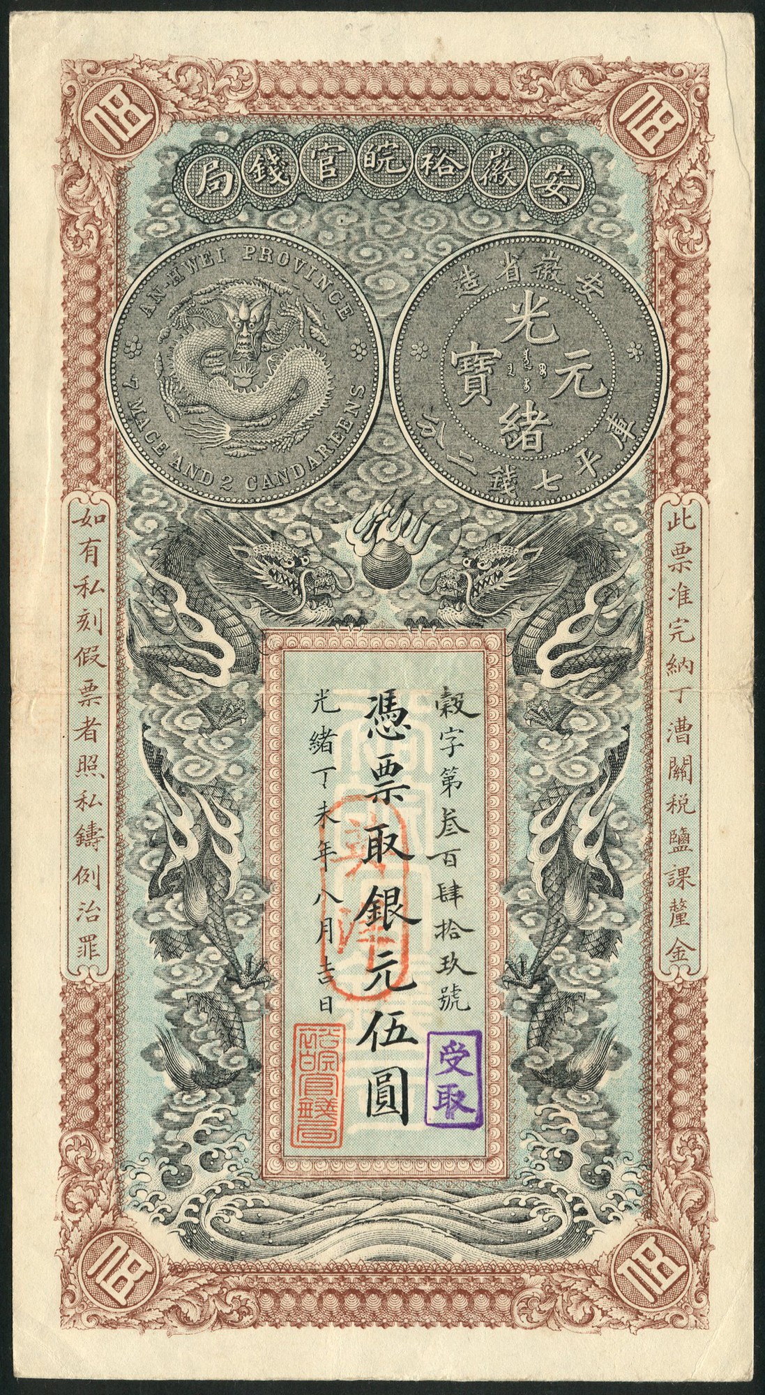 Anhwei Yu Huan Bank, $5, 1907, serial number 349, vertical format, brown border enclosing two black dragons, pictures of a Anhwei silver dollar on top, Chinese text on reverse