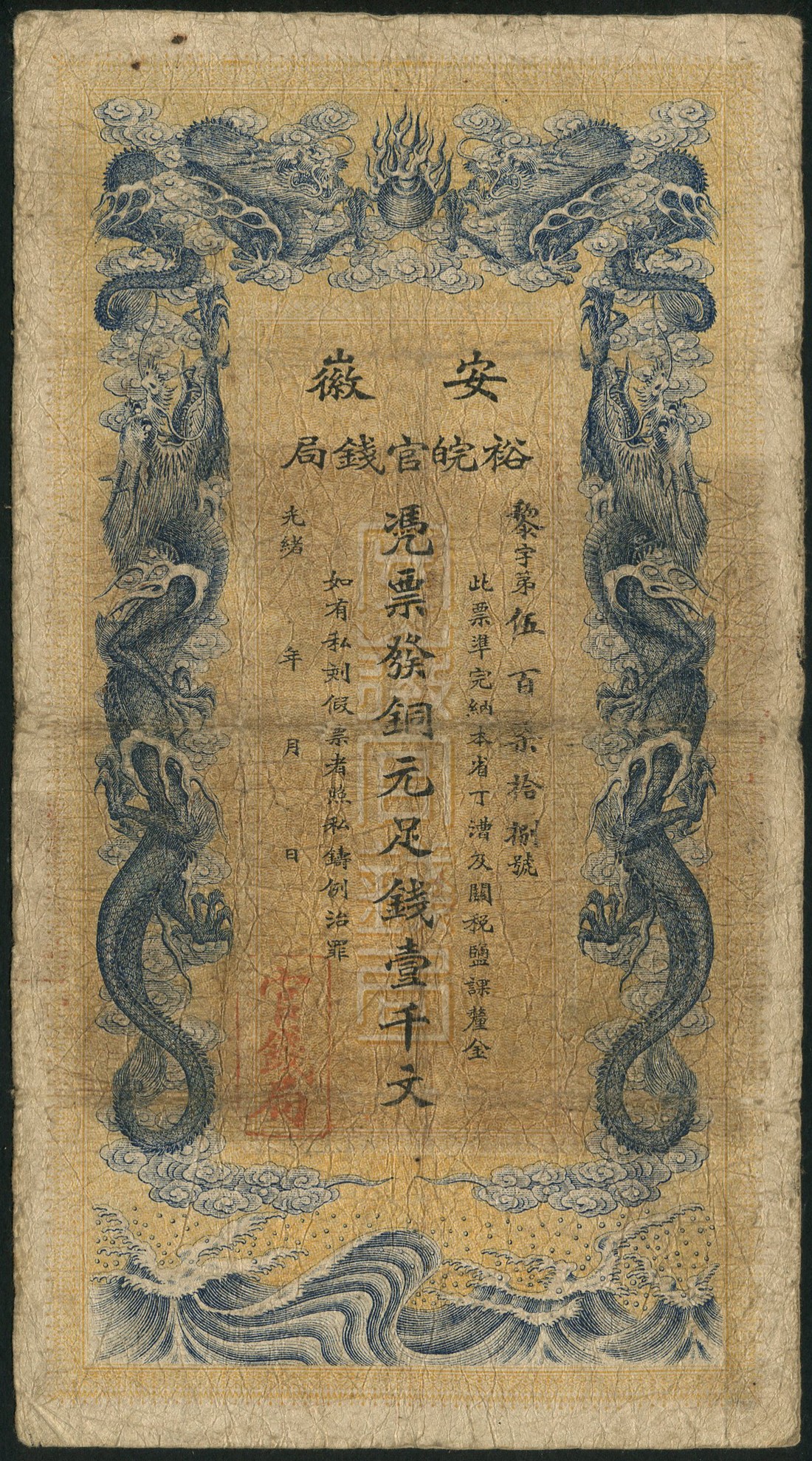 Anhwei Yu Huan Bank, 1000 cash (2), ca 1909, brown-yellow and blue, dragon at left and right, reverse green and white, text and large red seal at centre