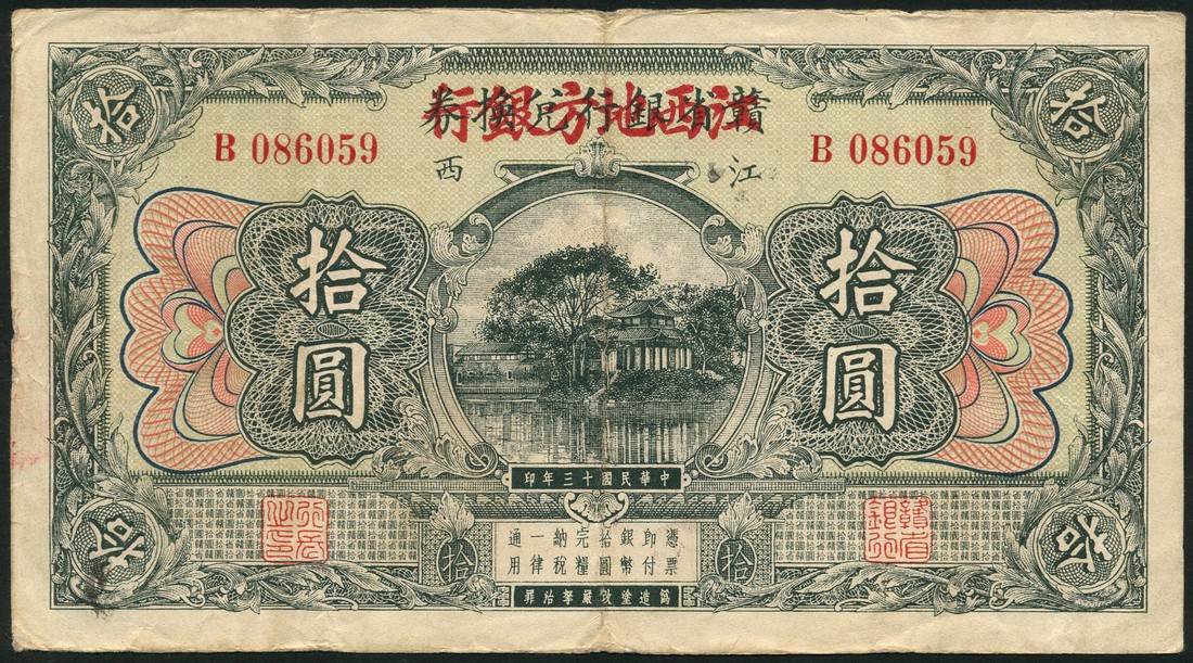 Kiangsi Regional Bank, $10, no date, serial B086059, overprinted on Kan Sen Bank of Kiangsi, old date 1924, dark green on light green, Chinese pavilion by lake at centre, overprint bank name in red Chinese characters, reverse orange, walled village at centre, purple chopmark