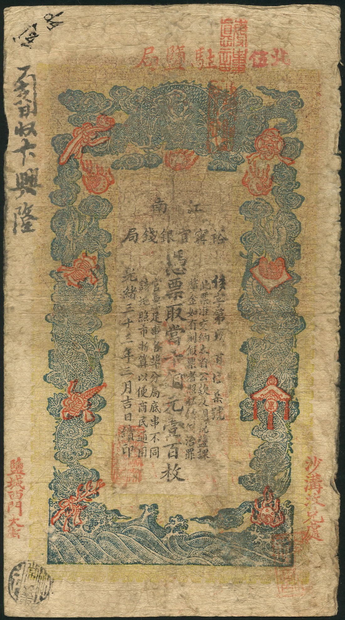 Kiangnan Yu Ning Government Bank, 100 coppers, 1907, serial number 967, vertical format, green and blue, ornate dragon border, Chinese text and multiple red chops on reverse