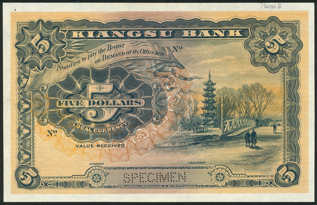 Kiangsu Bank, specimen $5, ND (1913), no serial numbers, green, blue and brown, lions supporting globe top centre, value at left and right, reverse dark green, brown and orange, pagoda in park at right, value at left and at each corner