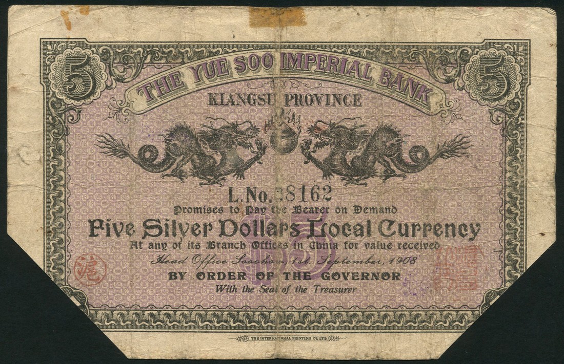 Yue Soo Imperial Bank, $5, 1908, serial number 08162, brown border, green obverse with denomination at centre and dragons at top, reverse dark grey and purple, two dragons chasing a fireball, clip cancelled