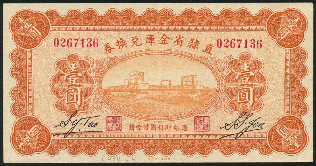 Chihli Province Treasury Exchange Notes, $1, 1928, serial 0267136, Chinese text on reverse with large red seal chopmark