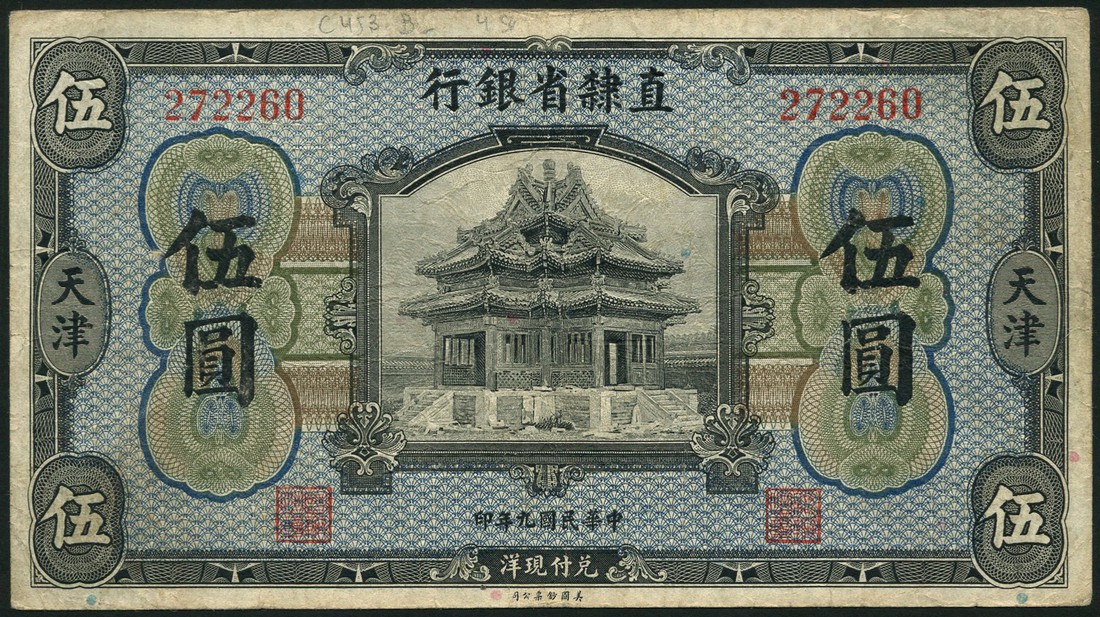 Provincial Bank of Chihli, $1 and $5, Tientsin, 1920, black on dark green and black on dark blue respectively, Chinese pavilion at centre, simple vignette on reverse