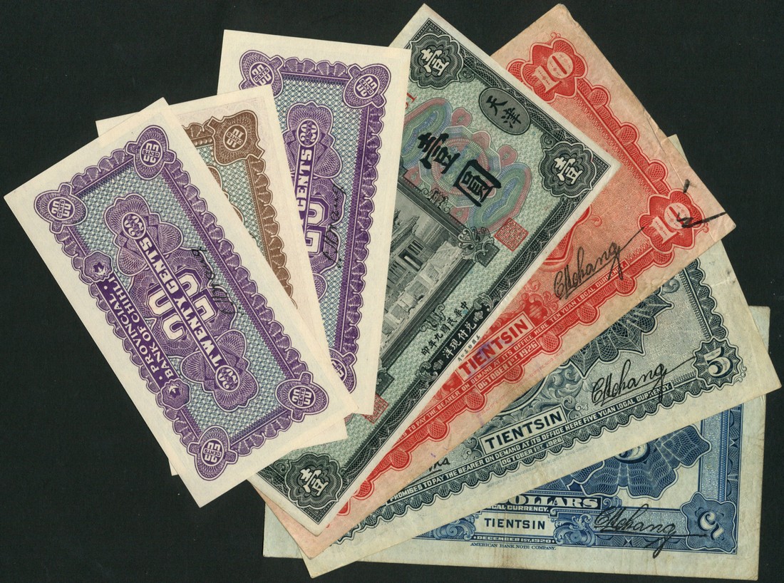 Provincial Bank of Chihli, a group comprising 10 cents, 20 cents (2), $1 and $5, Tientsin, 1920 and $5 and $10, Tientsin, 1926,