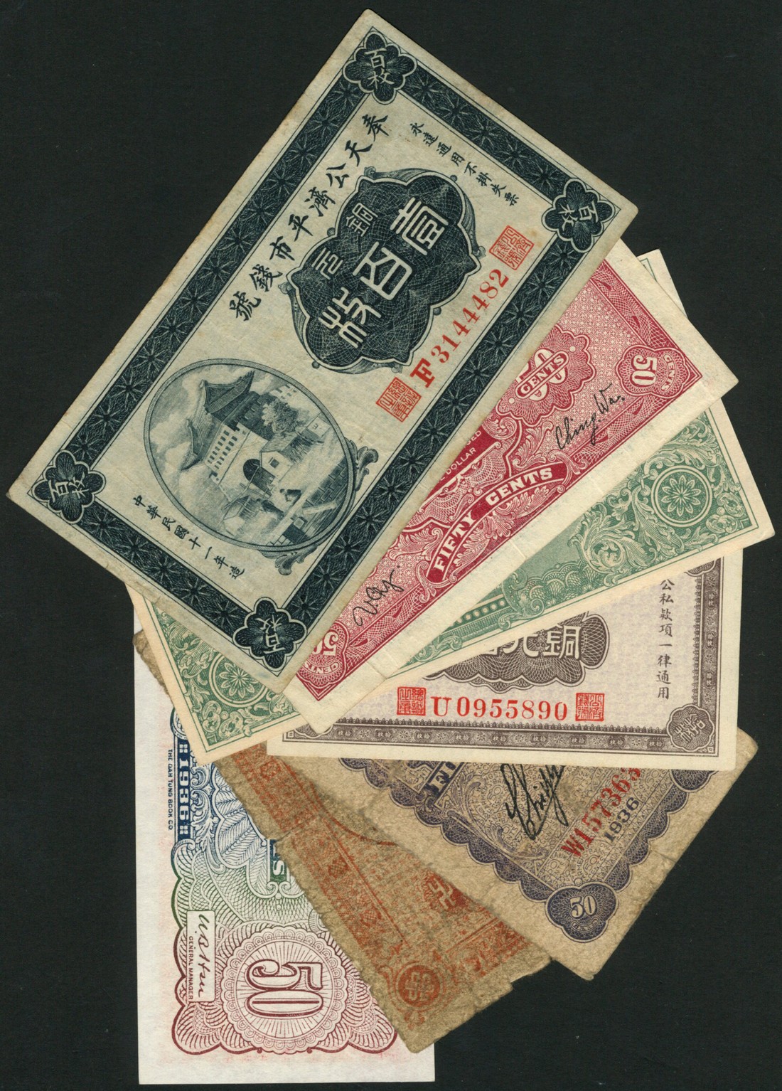 A miscellaneous group including Fengtien Public Exchange Bank, 10 copper coins, Kung Tsi Bank of Fengtien 100 coppers, 1922, , Yu-Ming Bank of Kiangsi and others
