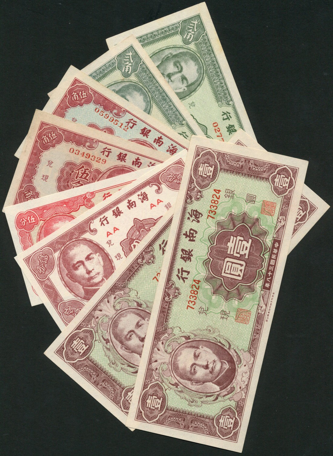 Hainan Bank, 2 cents, 5 cents (2), 20 cents (2), 50 cents,1949, 1 yuan (2), 1949, green and violet, Sun Yat Sen at left