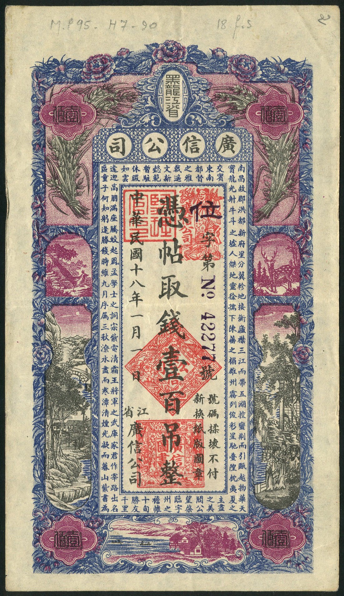 Kwang Sing Company, 100 tiao, 1929, serial number 42277, purple, black and blue, allegorical scenes within border