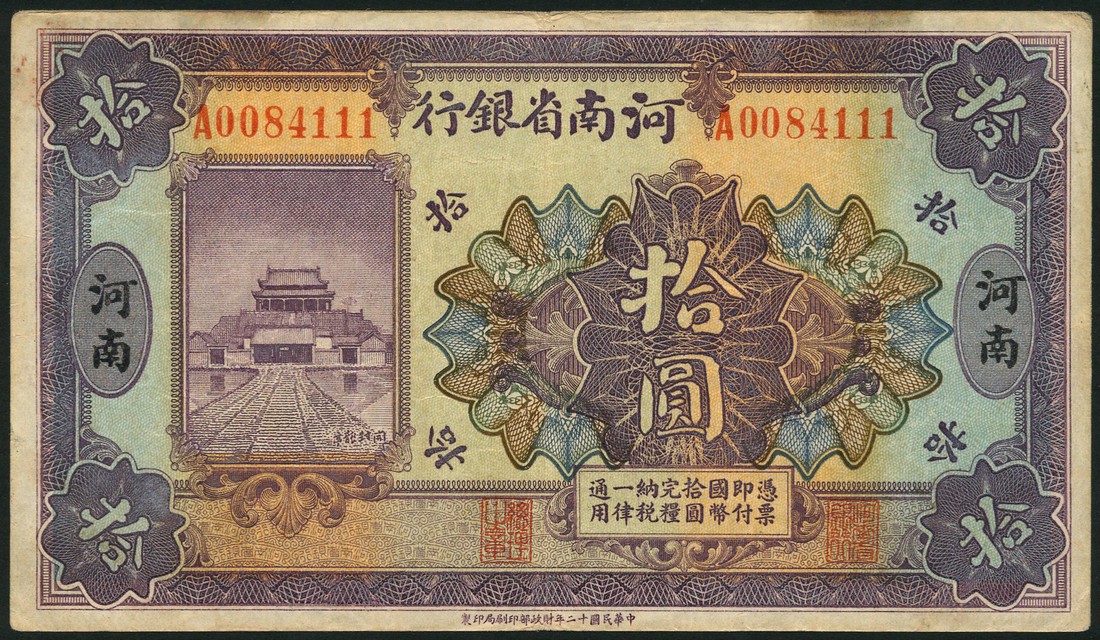 Provincial Bank of Honan, 5 yuan and 10 yuan, Honan, 1923, red serial numbers, green and purple respectively, similar designs with Chinese building on obverse, simple vignette with value on reverse