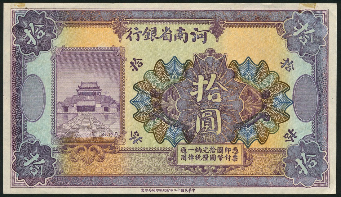 Provincial Bank of Honan, proof/specimen 10 yuan, 1923, no serial numbers or signatures, purple and orange, Chinese building at left, reverse green with 'ten yuan' in vignette