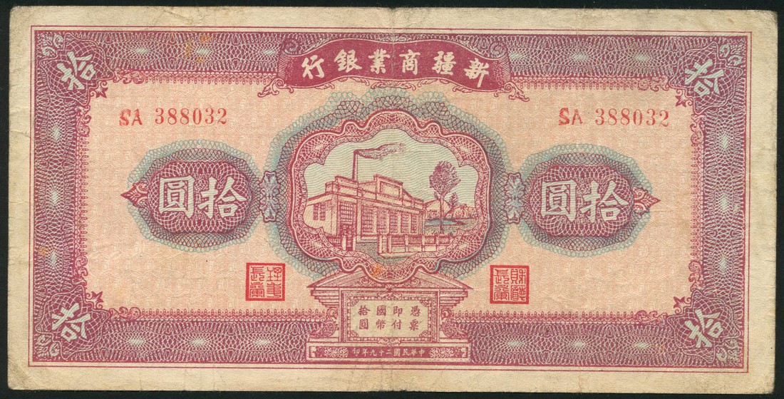 Sinkiang Commercial and Industrial Bank, 10 yuan, 1940, serial number SA388032, red on pale pink and blue underprint, factory at centre, reverse mountain scene