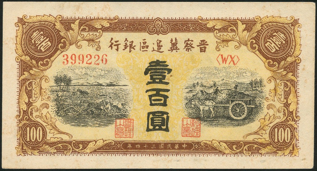 Bank of Shansi, Charhar and Hopei, 10 yuan, 1945, red serial numbers, red-brown and pale blue, the Great Wall at centre, also 100 yuan, 1945, red serial numbers, brown and pale yellow, agricultural scene at left and right