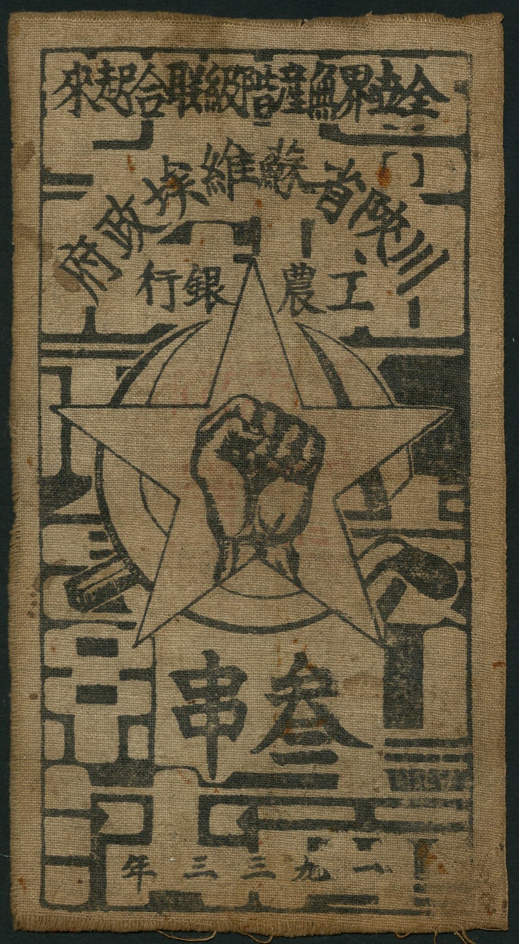 Szechuan-Shansi Bank Provincial Soviet Workers and Farmers Bank, 3 ch'uan, 1933, black text on pale brown cloth, clenched fist, star and crescent at centre, red seal at centre