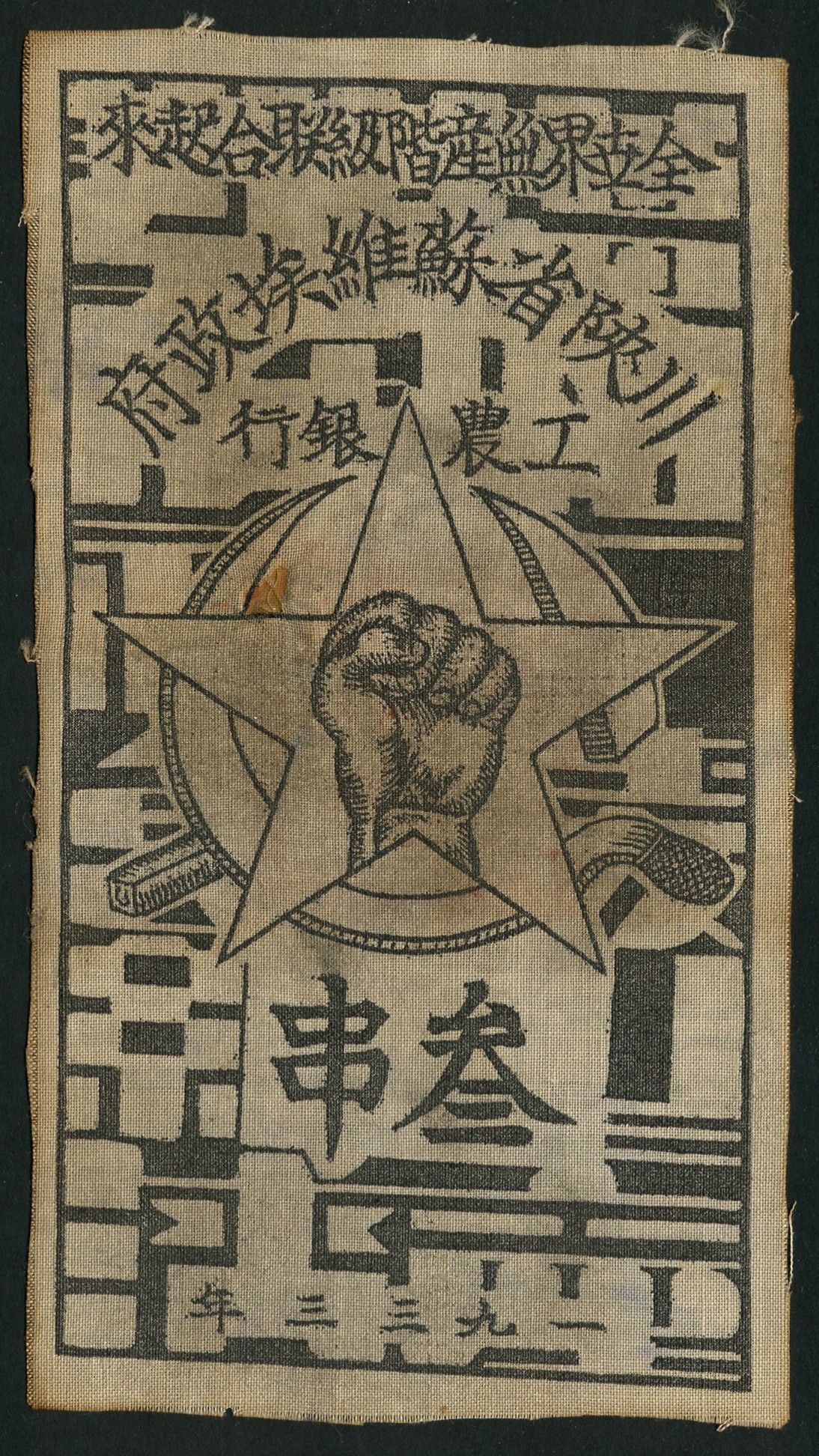 Szechuan-Shansi Provincial Soviet Workers and Farmers Bank, 3 Ch'uan, 1933, black text on grey cloth, clenched fist and hammer and sickle at centre, reverse black design, red seal at centre