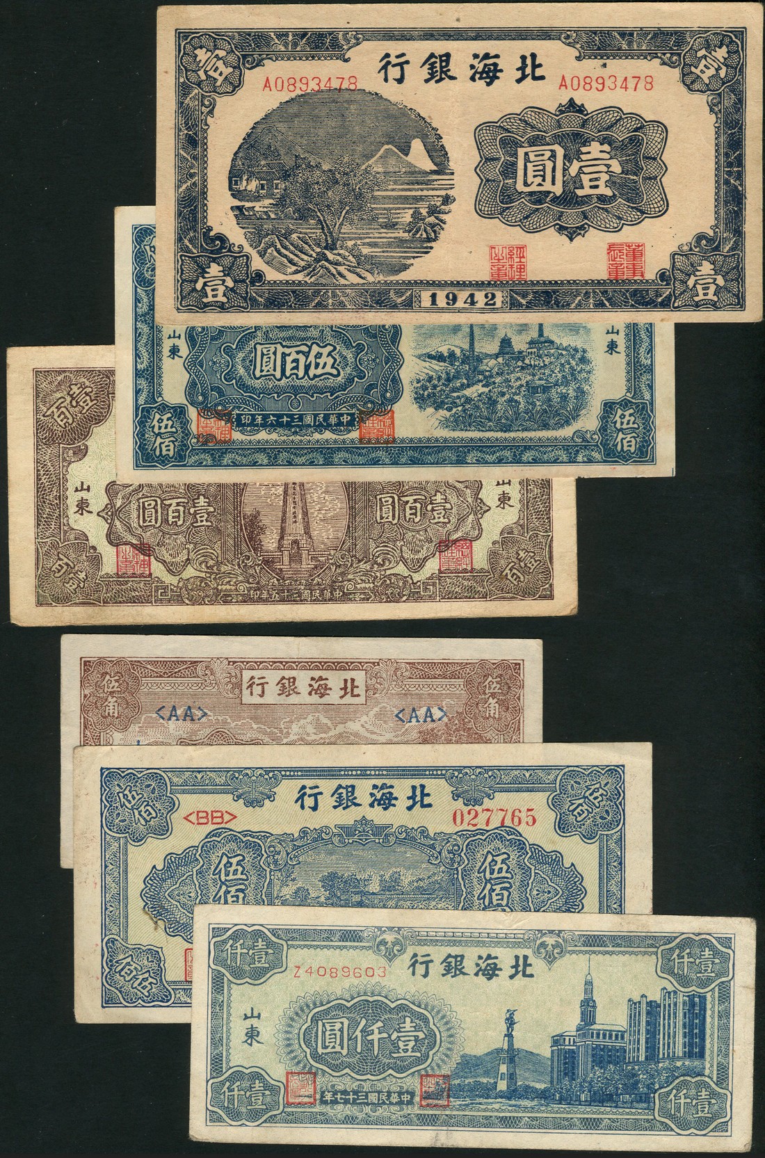 China, Communist issues, a selection comprising 1 yuan, 1942, blue, 50 cents, 1943, brown, farmer and oxen, 100 yuan, 1946, brown, monument, 500 yuan, 1947, blue, radio station, 500 yuan, 1947, blue, lake, 1000 yuan, 1948, blue, monument and buildings