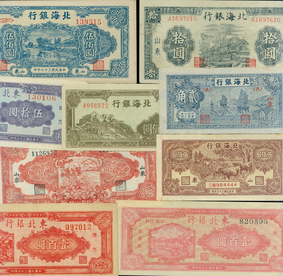 Bank of Bai Hai, 2 jiao 1943, 10 yuan 1944, 200 yuan 1944, 500 yuan 1947 and 500 yuan 1948 x2, also Tung Pei Bank of China 50 yuan 1947, 100 yuan 1947 x2 (Pick S3553J, 3565C, 3573a, 3620E, 3622Bb, 3622, 3746, 3749, 37500), extremely fine to uncirculated, very scarce in these high grade