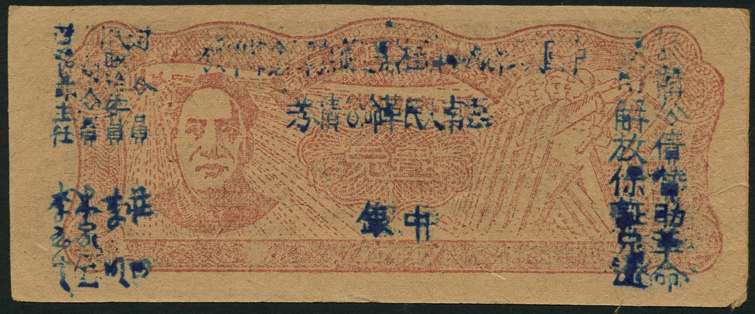 Kwansi-Kweichow Yunnan Border District, Dianki Gui Bianky, emergency currency for 1 yuan, 1949, red serial number BT 056 BI, brown, Mao tse tung at left, reverse black on brown, farmers at left,