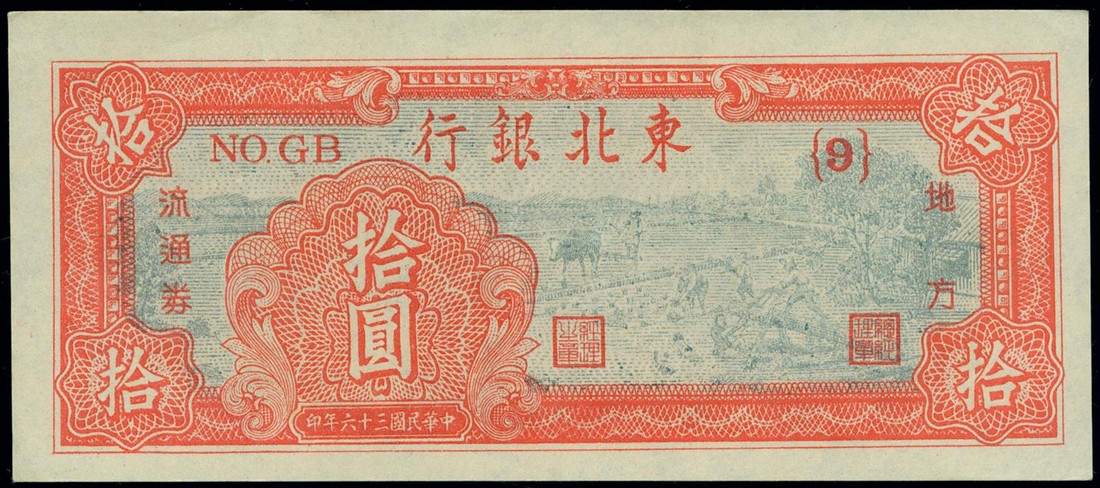 Tung Pei Bank of China, 10 yuan and 100 yuan, 1947, red/grey and red/yellow respectively