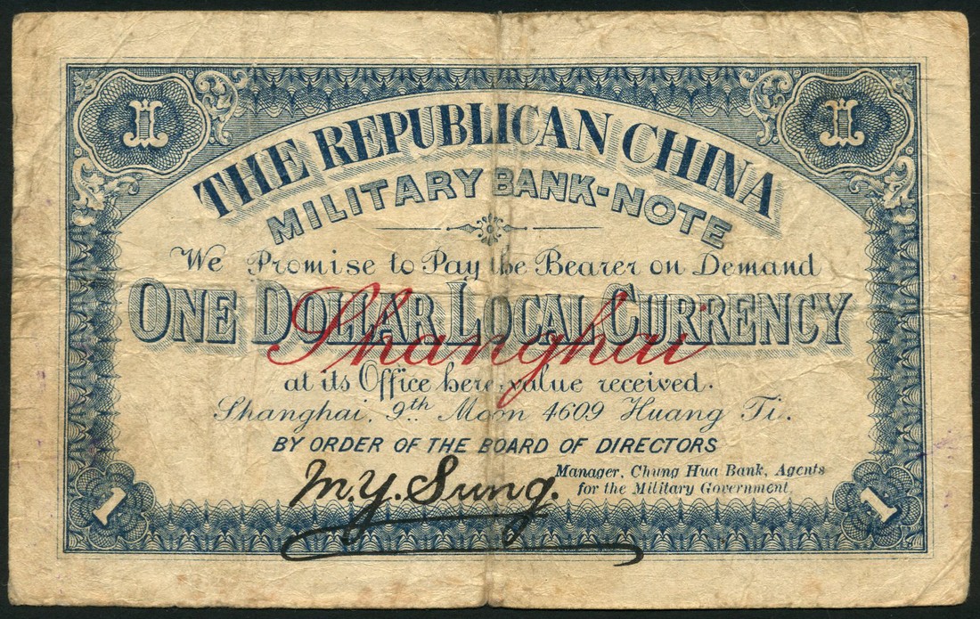 Republican China Military Banknote, $1, Shanghai, 1912, red serial number 171956, brown and white, value at centre and at each corner, Chinese text, reverse blue and white with Enlish text and red 'Shanghai' in ornate scrip printed at centre