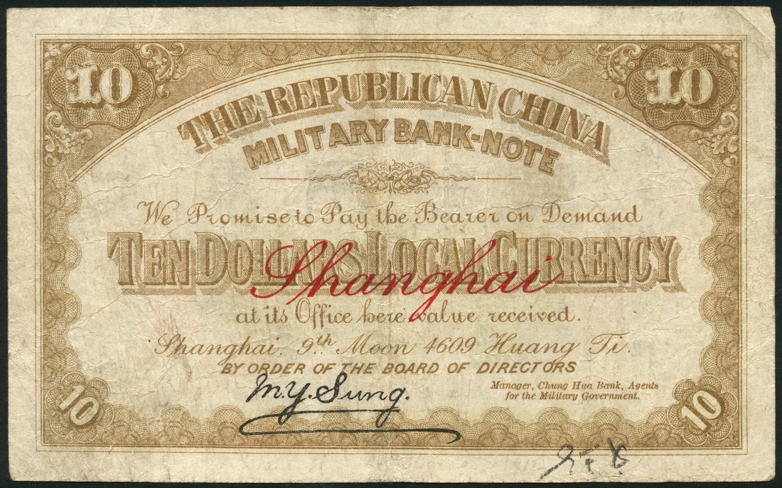 Republican China Military, $10, Shanghai, 1912, red serial number 000614, green and white, Chinese text on obverse, brown and white on reverse, English text