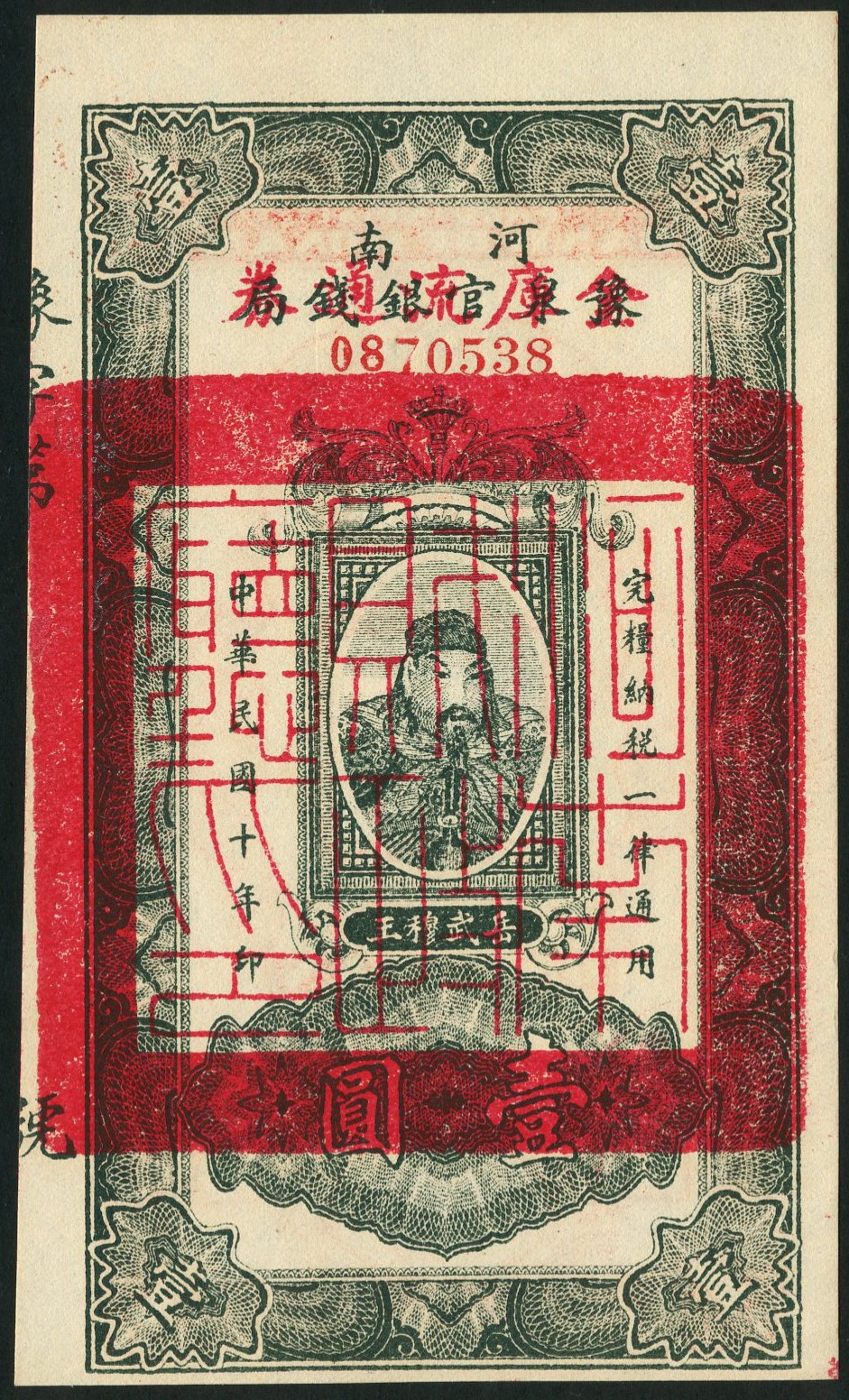 Honan Provincial Treasury, 1 yuan, old date 1921, serial number 0870538, vertical format, Yue Fei at centre, overprint in red Chinese characters, large red square seal, reverse red