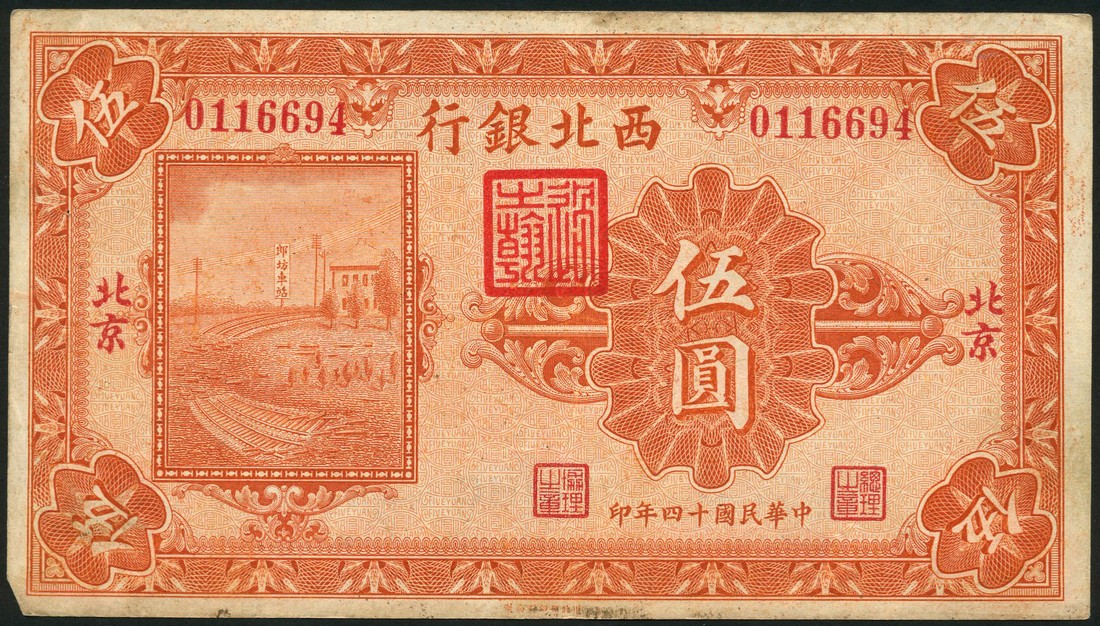 Bank of the Northwest, 10 copper, Fengzhen, 1925, blue and pink, overprinted 'Fengzhen Circulating Note' in black Chinese characters, also 5yuan, 1925, Beijing, orange