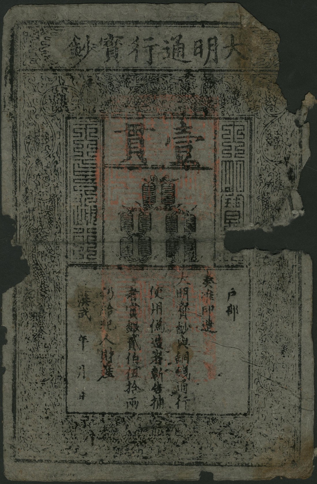 Ming Dynasty, Da Ming Bao Chao, 1 kuan, ND (1368-1399), black text on grey mulberry bark, two rectangular red seals on face, 10 strings of cash at centre