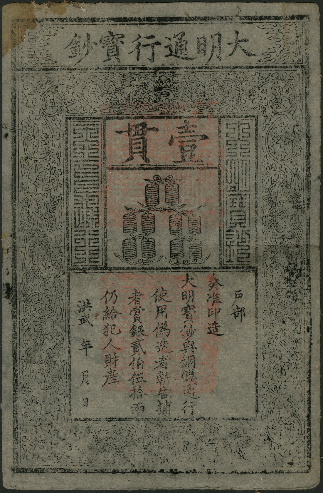 Ming Dynasty, Da Ming Bao Chao, 1 kuan, ND (1368-1399), black text on grey mulberry bark, two rectangular red seals on face, 10 strings of cash at centre