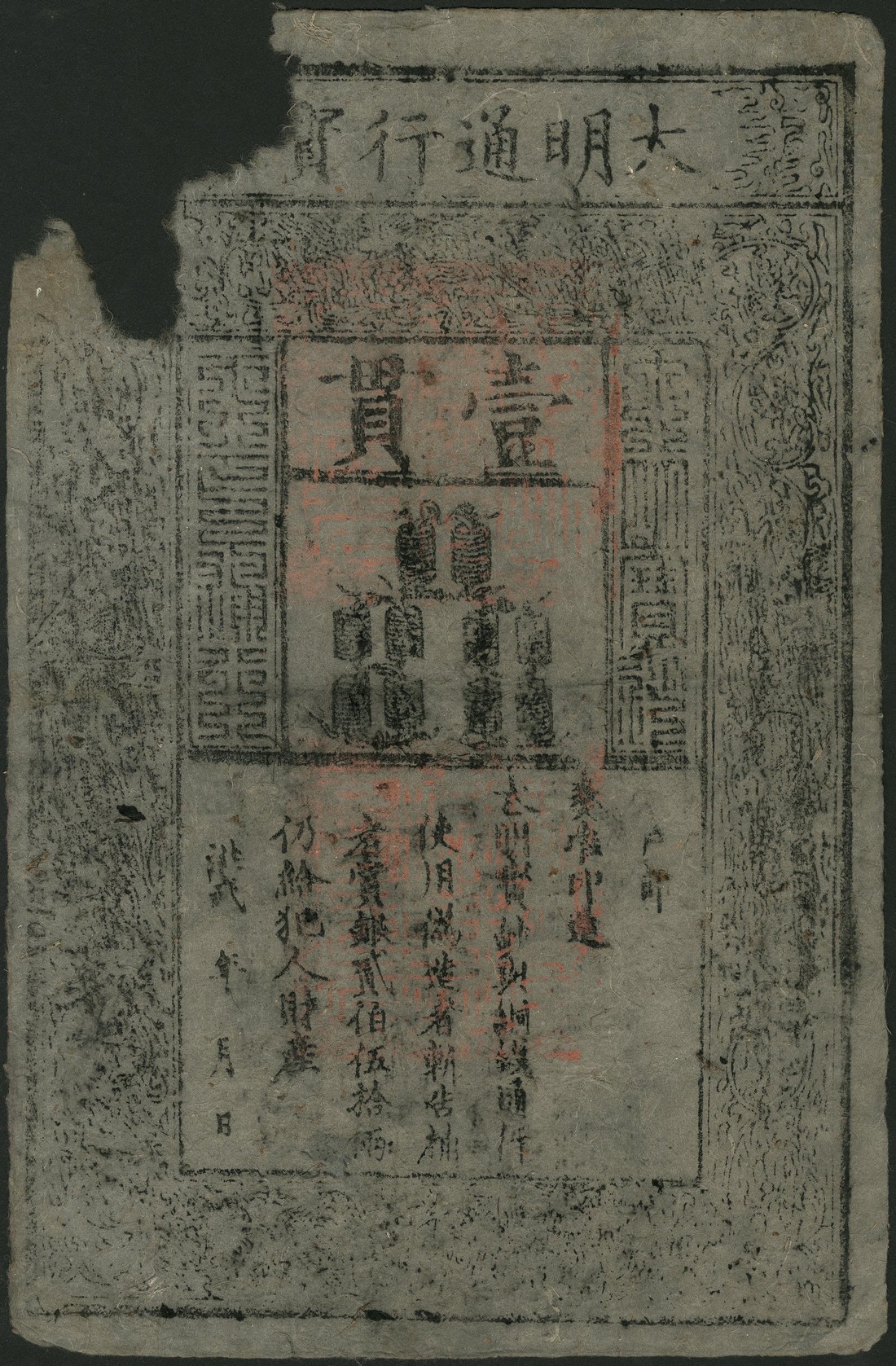 Ming Dynasty, Da Ming Bao Chao, 1 kuan, ND (1368-1399), black text on grey mulberry bark, two rectangular red seals on face, 10 strings of cash at centre