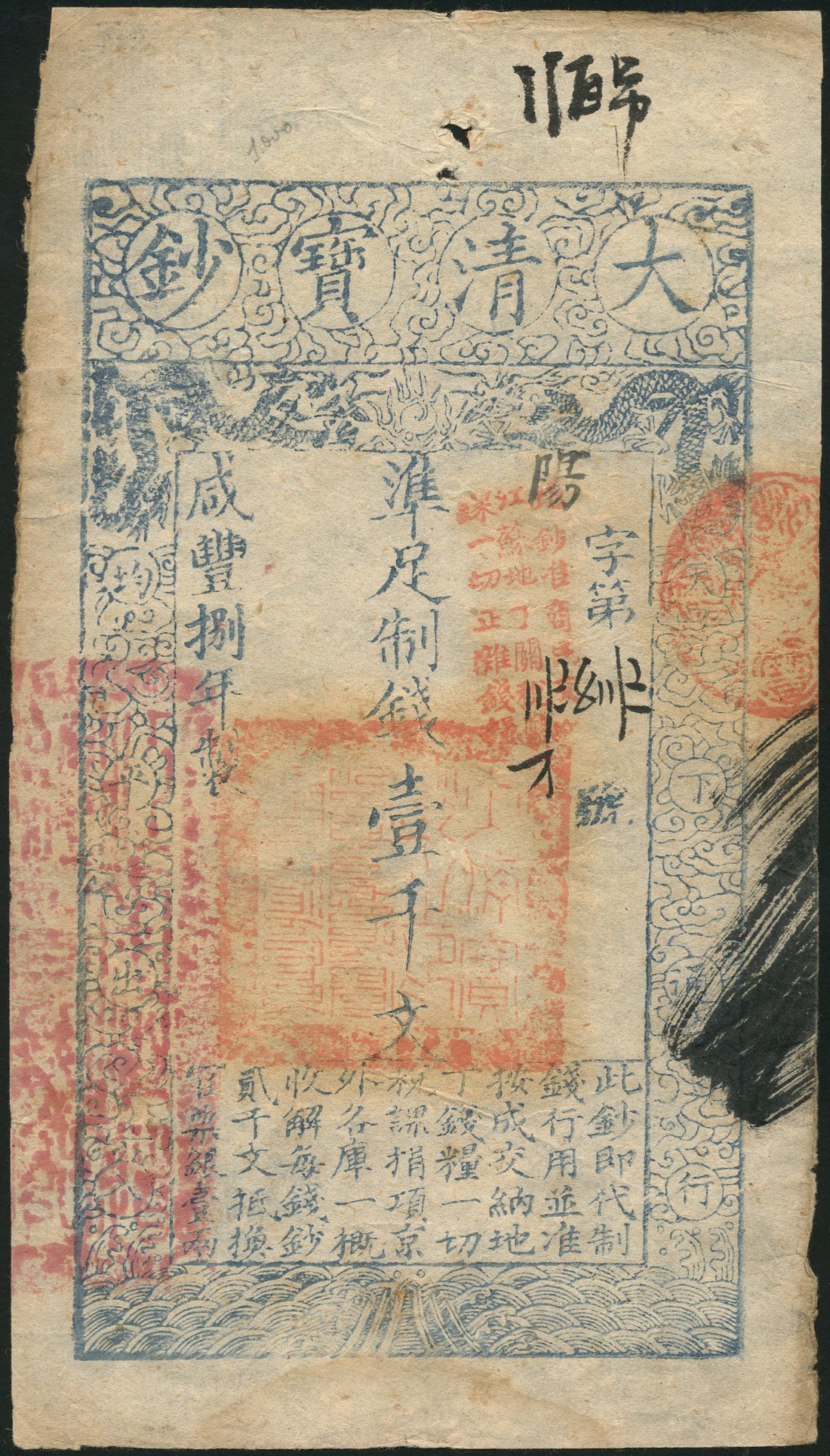 Qing Dynasty, Da Qing Bao Chao, 1000 cash, blue text on cream parchment like paper, red seals on face