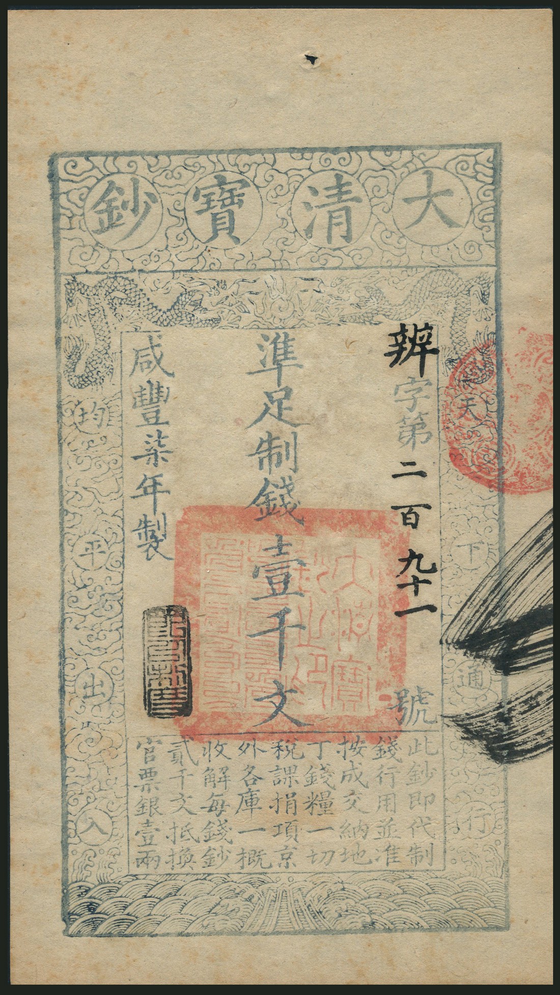 Qing Dynasty, Da Qing Bao Chao, 7th Year of Xianfeng (1857), 1000 cash, serial number 'Bian' prefix 291, blue and white, dragons in top field, two red chop marks, merchant stamps and brush writing on reverse