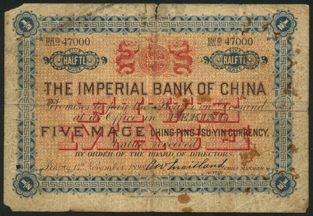 Imperial Bank of China, 5 mace, Peking, 14 November 1898, serial number 47000, blue and red and pale orange, red seal and dragons top centre, reverse as obverse but Chinese text