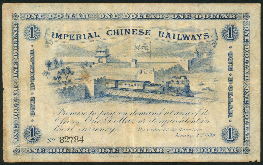 Imperial Chinese Railways, part issued $1, 2 January 1899, serial number 82784, blue and white, locomotive and fort at centre, reverse red and white, bridge