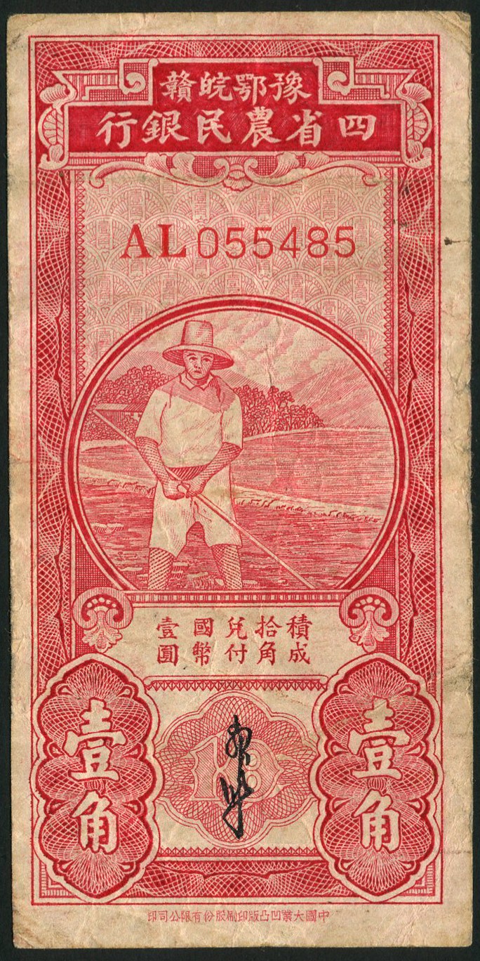 Agricultural Bank of the Four Provinces, 1 jiao (2), 1933, serial numbers P198551 and AL055485, vertical format, red, peasant at top, grey-green reverse. 2 different serial number types