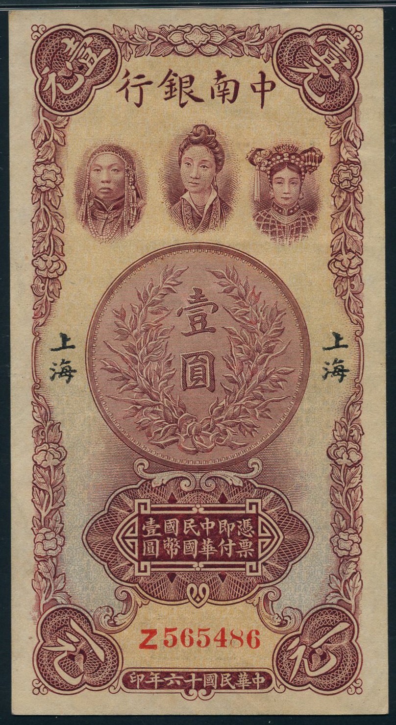 China and South Sea Bank Limited, 1 yuan, Shanghai, 1927, red serial number Z 565486, purple and pale yellow, three women top centre, 1 yuan coin at centre, value at each corner, reverse brown, pink and pale green, a Yuan Shih Kai dollar at centre