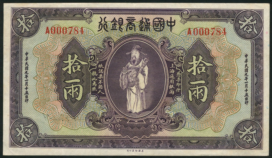 Commercial Bank of China, 10 taels, Shanghai, 15 January 1920, red serial number A 000784, purple and multicoloured, the God of Wealth at centre, reverse brown, seal and lions at centre, value at left and right, two printed signatures below